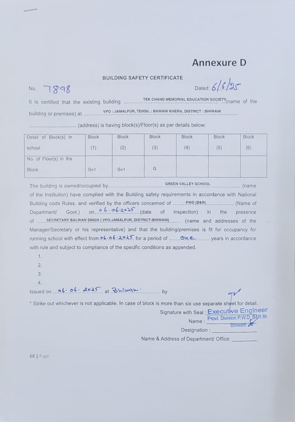 COPY OF VALID BUILDING SAFETY CERTIFICATE AS PER THE NATIONAL BUILDING CODE |